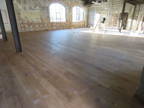 Der Fußboden ist gelegt. Schöne Eichenpanelen lassen die künftige Raumatmosphäre bereits erahnen. Auch die Küche ist mittlerweile gefliest. Es herrscht also emsiges Treiben an allen Ecken und Enden.
