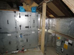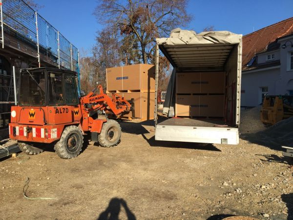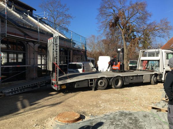 Die Lüftungsanlage (6000 m³/h) für die Küche wurde vom Dach bis zur Küche komplett eingebaut. Elektriker und Verputzer werden in den nächsten Wochen ihre Arbeiten im Kopfbau und in der Halle abschließen können.